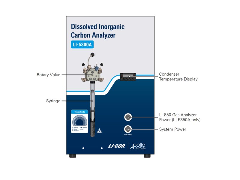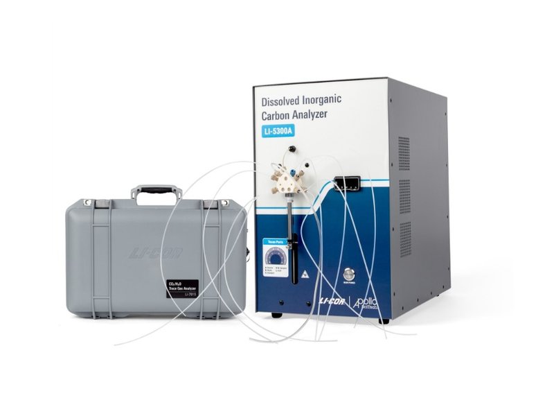 Cada analisador de DIC inclui um analisador de gases secundário obrigatório. O analisador de gases traço CO₂/H₂O LI-7815 é ideal para medições precisas em água do mar. O analisador de DIC e o analisador de gases trabalham em conjunto para medir com exatidão o DIC em uma amostra de água. O analisador de DIC é composto por uma bomba de seringa Tecan XLP6000, um sistema de válvula de 12 portas, um condensador Peltier, um controlador de vazão mássica e um computador com software proprietário para aquisição e análise de dados.